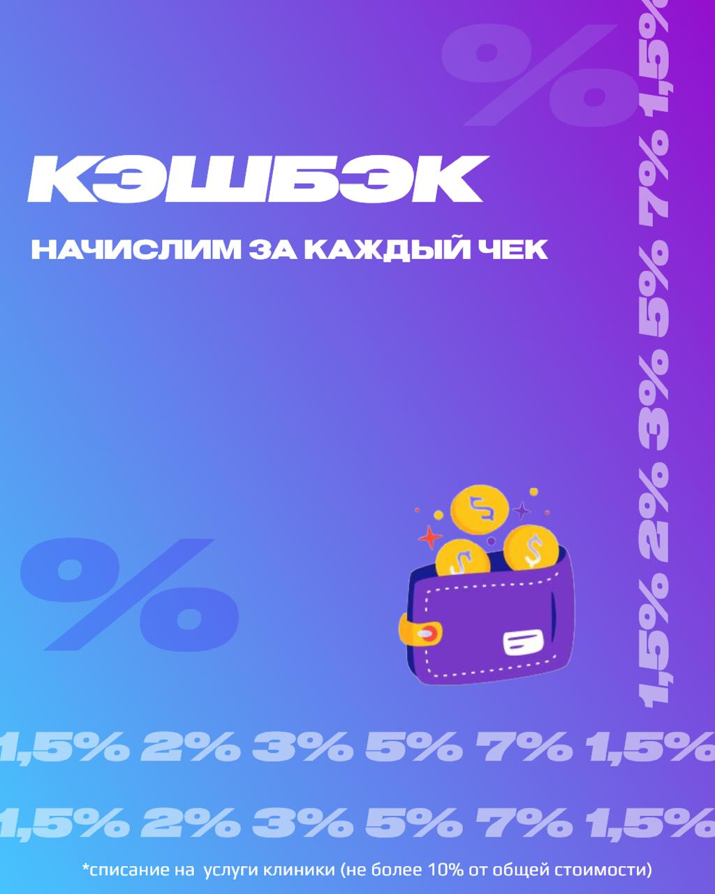 В нашей клинике действует бонусная система лояльности. От 1,5 до 10 % кэшбэка от суммы чека возвращается вам на лицевой счет.